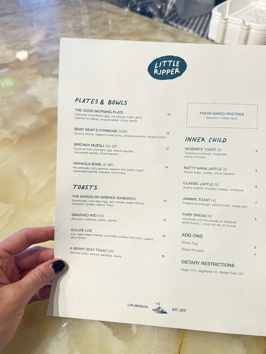 The café also offers delicious non-coffee drinks, such as their perfectly crafted Hot Chocolate or the kid-friendly Kidccino. Whether you’re stopping by for breakfast or dinner, Little Ripper LA promises an experience that is warm, inviting, and full of flavor.